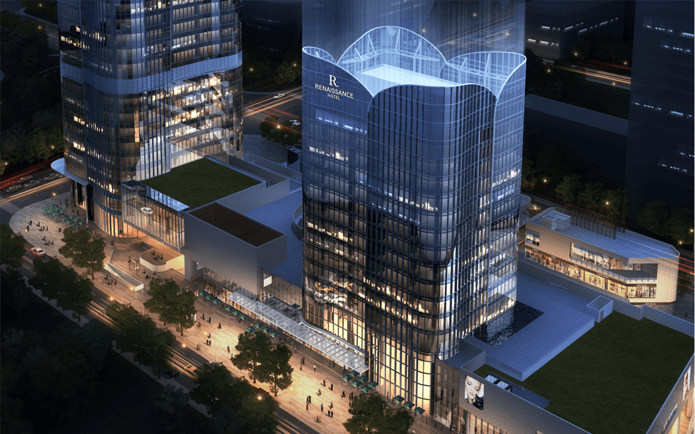 萬麗酒店總建筑面積:200653.85㎡,其中地上建筑面積122504.63㎡,包括1棟43層(79619.86㎡)的超高層國際5A甲級寫字樓(T1塔樓);1棟18層(33500㎡)的國際知名品牌酒店(T2塔樓);1棟獨棟及商業裙樓(7120.98㎡);五層地下室總建筑面積78149.22㎡,包含5000㎡的商業地下室,1216個機動停車位及設備用房。